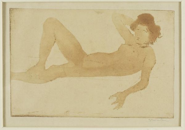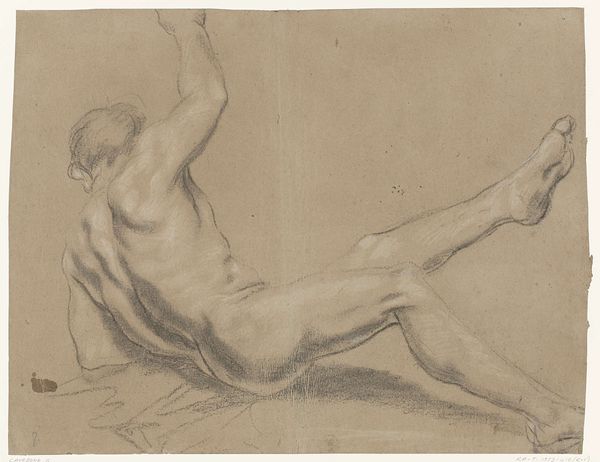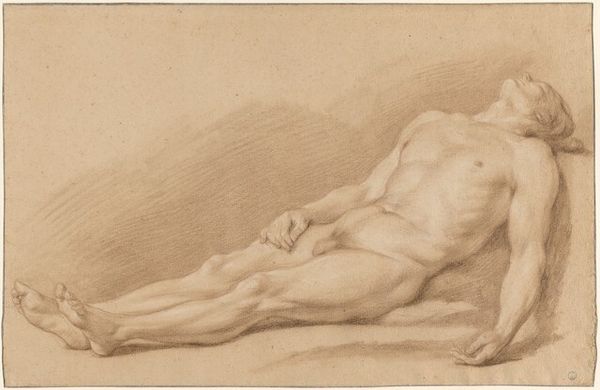 Curator: This is "Study of a Half-Lying, Half-Sitting Boy" by Giuseppe Bottani, dating approximately from 1727 to 1784. It's currently housed here at the Rijksmuseum. Editor: It’s immediately striking how softly lit the figure is, almost luminous against that terracotta paper. The pose is both relaxed and subtly melancholic. Curator: It is a portrait in the academic style, focused intensely on realism. Drawings like these were preparatory studies. We should consider the cultural climate in which the male nude was studied. Were these models able to exercise their own agency and how might issues like consent have played out? Editor: Absolutely. But purely from a formal standpoint, look at the dynamism achieved with minimal lines. Notice the textures: the cross-hatching that defines the ground and the smoother, more continuous lines used to contour the boy's form. Bottani's mastery of line and shadow creates an undeniable tension, and thus an arresting form. Curator: The vulnerability expressed through the boy’s pose surely intersects with how youth and innocence were framed during that era. As a prep sketch it is likely one of many and therefore offers an interesting insight into the way his students at that time understood beauty, form and gender. How might his identity have affected his relationship to the work? Editor: Possibly. The tonal uniformity—that pervasive reddish hue—creates an interesting flattened effect. It denies a certain depth. Perhaps it underscores a move away from illusionistic representation and towards emphasizing line and form. Curator: Right, but how are we viewing that representation today? We cannot divorce these images from current conversations about the male gaze and representation. Examining it under this light reveals an inherent power dynamic that simply cannot be ignored. Editor: Indeed. It really is remarkable to consider how a seemingly straightforward study like this offers endless entry points and provokes diverse interpretations, from its historical origins to its contemporary implications. Curator: Indeed, what's rendered, why and by whom requires endless probing, making even preparatory drawings complex dialogues about aesthetics and power.