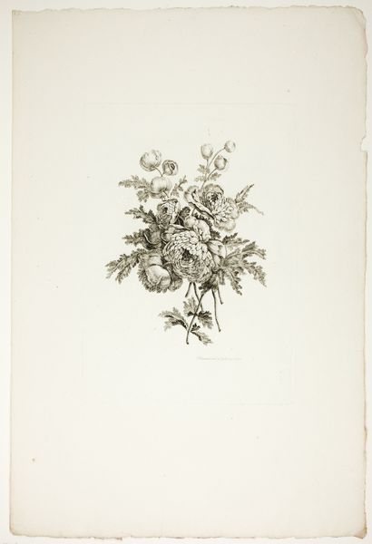 Curator: Welcome. Here we have Etienne Claude Voysard's "Jachttrofee," an engraving from 1778 currently held in the Rijksmuseum. Editor: Striking, isn't it? The high contrast immediately draws you in, although it presents a rather grim juxtaposition of death and fragile, blossoming life. Curator: Indeed. Observe the careful arrangement of elements. The central fox head is framed by an elegant arrangement of foliage, hunting spears, and a net. The composition achieves balance through the symmetrical placement of the floral elements and the angular weapons. The formal containment afforded by the image’s simple frame gives it structural strength. Editor: And consider the process itself: engraving. The lines, etched by hand into a metal plate, then transferred to paper. Each print is an echo of labor. Note how the fox appears almost collaged within these trappings. The fruits and foliage rendered beside it contrast sharply, highlighting both nature’s bounty and humanity’s violent control. The whole enterprise speaks to both social ritual and practical necessities. Curator: Note how Voysard employs a classically Baroque sensibility here, albeit softened for a late 18th-century audience. There's a delicate dance between the organic and the geometric, nature and artifice, echoed by the medium itself: the artifice of the engraver bringing to life the forms of the natural world. Editor: Absolutely. And further, there's a commentary on the value system inherent in the practice of hunting, an exploration of who—or what—gets commodified, preserved, or discarded according to human design. What a statement about class and land ownership in that moment! Curator: Quite so. It is a sophisticated visual essay in monochrome. The image certainly delivers complex aesthetic pleasures, offering an intriguing interplay between tradition, symbolic weight, and the sheer artistry of line. Editor: It’s a beautiful and somewhat discomforting object, asking viewers to unpack our complex relationship with the natural world and modes of production. It invites consideration of both method and motivation within a specific social reality.