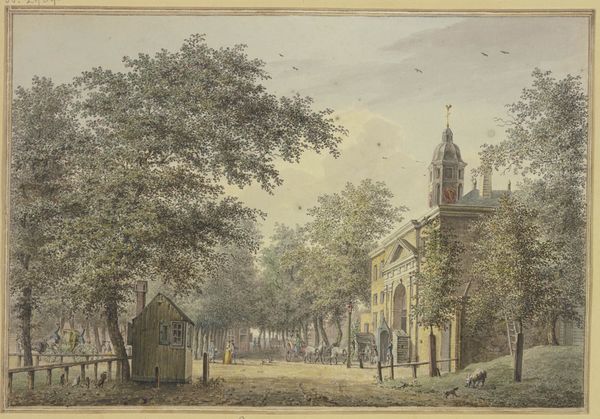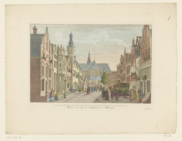 Curator: Here we have an intriguing image, a print titled "Gezicht op Somerset House en de kerk Saint Mary-le-Strand te Londen," or "View of Somerset House and St. Mary le Strand Church in London" by Nicolas Jean Baptiste Poilly, created after 1722. Editor: My immediate impression is of ordered commerce, rendered delicately. The subtle wash of color applied to the engraved lines adds a sense of everyday labor, softened by the gentle palette. What material evidence anchors this for you? Curator: Absolutely. Beyond just documentation, there is symbolic importance at play here. We see the grandeur of Somerset House, representing worldly power, balanced against the spire of St. Mary-le-Strand, representing spiritual authority. This tension, rendered in a Baroque style, echoes societal dynamics of the period. These carefully balanced institutions project a controlled urban scene but hide human realities. Editor: True, and if we think about the materials, an engraving allows for reproduction, wider consumption and accessibility compared to say a painting done in oil that would have probably catered to wealthier, aristocratic crowds. Printmaking involves specific labor and skill—engraving the plates, pulling the prints, and even applying the color. Consider the economic structure supporting its creation; was Poilly making these for a wealthy patron, or to be sold in prints shops? The availability shapes the artwork’s impact in London’s culture. Curator: Precisely. The visual language further emphasizes established hierarchies. Consider the church itself. St. Mary-le-Strand was rebuilt by James Gibbs, meant to communicate established values, the sacred. We see the artist choosing an elevated viewpoint, one that not only grants perspectival depth, but allows Poilly to establish their dominance and command over the depicted urban area. Editor: An important view of labor that allows an understanding of power. Curator: A view of more than just aesthetic consideration or documentary, offering insight into how cultural forces manifest materially. Editor: This work illuminates the intersection of place, purpose and making for a London populace and time.