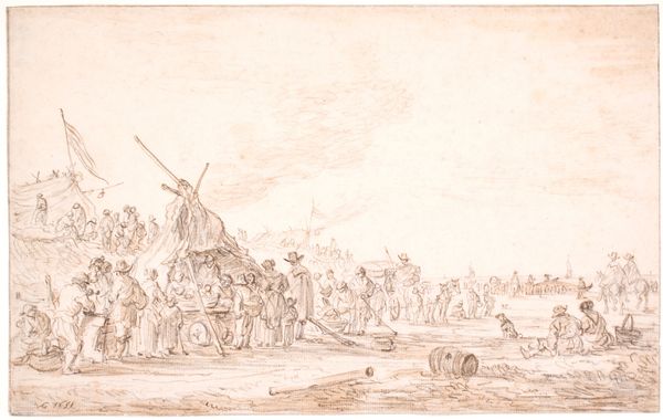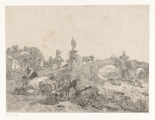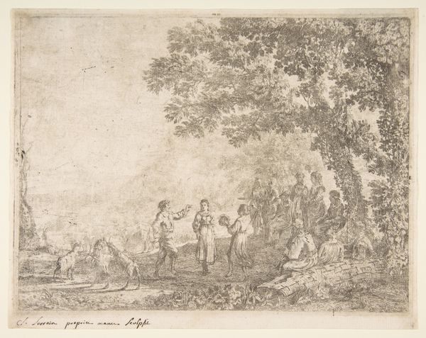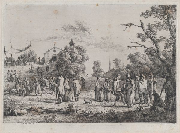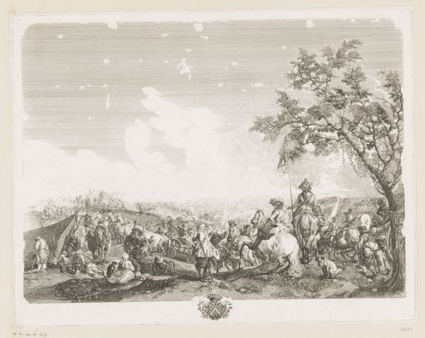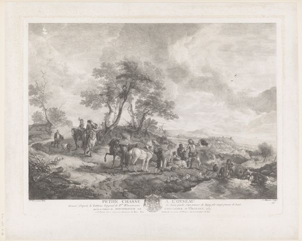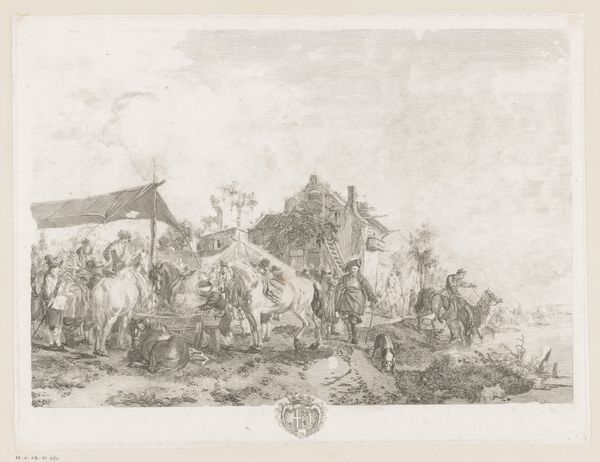 Jean Moyreau created this landscape with horse traders at a market using etching. It's a scene dominated by varied textures, achieved through intricate lines and tonal shifts, evoking a sense of a bustling rural atmosphere. The composition invites a structural reading: the foreground is filled with the chaotic energy of the market, while the background features a serene townscape, creating a contrast between human activity and natural order. The stark division destabilizes traditional landscape expectations, questioning the role of humanity within its environment. The perspective guides us from detailed foreground figures to the distant town, suggesting a semiotic relationship between the micro-actions of the market and the macro-structure of society. The etching challenges the viewer to consider how the act of depiction shapes our understanding of the world. Moyreau doesn’t just represent a landscape; he presents an interpretation, filtered through the formal qualities of the printmaking process. The textures of the image become a part of the dialogue about commerce, society, and art.