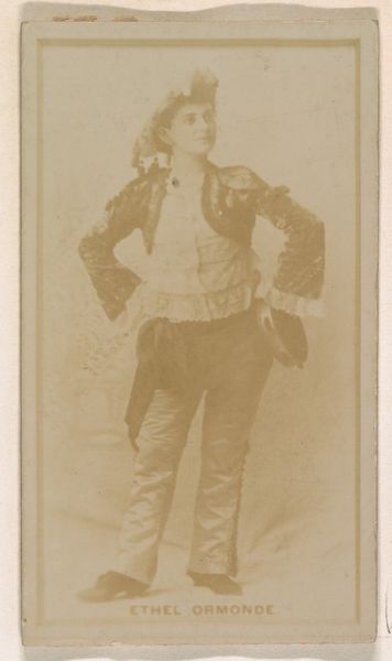 Curator: Here we have a print from 1890, originating with the Kinney Brothers Tobacco Company. This portrait, part of the Actresses series, showcases May Merrion, advertising Sweet Caporal Cigarettes. Editor: Isn't it amazing how a little photograph can transport you? She seems so full of mischief, ready to leap off the card. You can almost smell the stage makeup. Curator: The Metropolitan Museum of Art now houses this work, and it provides valuable insight into the intertwined histories of entertainment, advertising, and celebrity culture in the late 19th century. Editor: She's got a bit of a devilish grin too. That plus the almost pirate-like outfit, it feels as though she’s breaking through the primness expected of the era. Is that intentional, or is that reading too much into a cigarette ad? Curator: These kinds of advertising images often challenged or reinforced social norms depending on their target demographic and intended message. May Merrion here is pictured in stage costume, which allowed for a certain theatricality not permitted in everyday settings. The goal, ostensibly, was to equate her attractiveness with the desirability of the product. Editor: Marketing genius! Still, her clothes suggest she may play a male role in theater? Genderbending wasn’t necessarily scandalous then; wasn’t there more latitude on stage? Or maybe I’m projecting. Curator: Cross-dressing performances were indeed popular and did allow a loosening of conventions. So it could suggest the cigarette brand had slightly progressive associations to appeal to the public at large. Editor: What a fascinating little glimpse into a bygone world. These tobacco companies inadvertently became patrons of portraiture. Curator: It underscores how advertising deeply influences our perception, shaping the narrative through cultural production and visibility. Editor: Yes, well, it looks like this actress and her sweet smokes made an impression, one puff at a time.