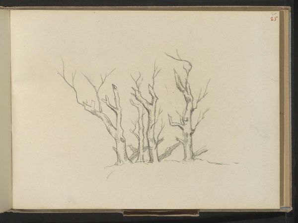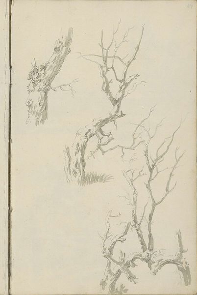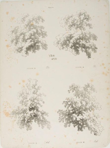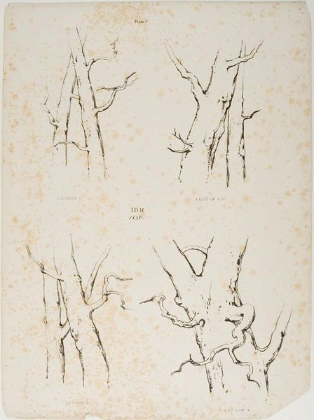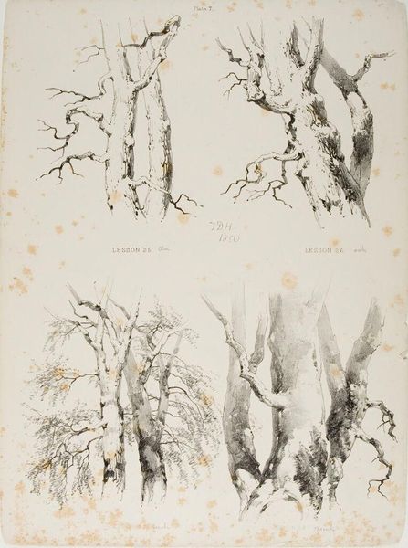 Curator: James Duffield Harding, born in 1797, presents us with "Lessons on Trees, plate 6," an exercise in form using graphite and grey wash. Editor: It's stark, almost skeletal. The bare branches reach out like grasping hands. What's striking is the absence—no leaves, no birds, just the raw structure. Curator: Harding masterfully employs line and shadow to convey the texture and volume of these tree trunks. Notice how each study emphasizes a different aspect of the arboreal form. Editor: Knowing the historical context is crucial: these "lessons" reflect a broader Victorian emphasis on nature as both beautiful and instructive, reinforcing specific social hierarchies. Curator: Indeed, but also as an exploration of pure form. Look at how Harding uses subtle gradations of tone to suggest depth and volume, turning simple studies into powerful visual statements. Editor: And what statement is that? Perhaps one about the endurance of nature, resilience in the face of adversity, or even the brutal realities of a changing climate? Curator: I think both readings can live alongside each other in this intriguing work, reminding us of nature's constant dialogue between function and form. Editor: Absolutely, a great lens through which to view this historical moment, a moment where nature was both idealized and exploited.