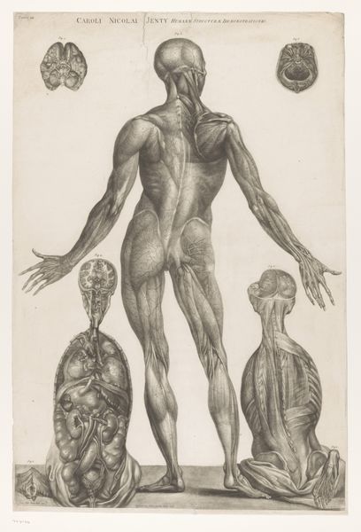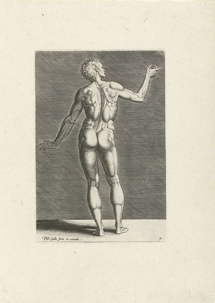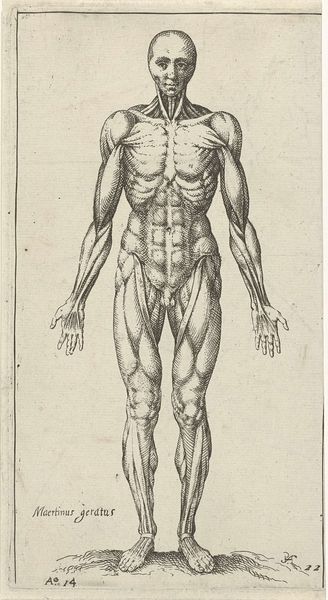 Philips Galle produced this print of a flayed human figure, or écorché, in the Netherlands sometime between the mid-sixteenth and early seventeenth centuries. The image reflects the growing importance of science and anatomical study in the period, and the increasing cultural authority of empirical knowledge. At this time, the dissection of human cadavers was becoming more common in medical schools and artists' workshops. In doing so, artists sought a deeper understanding of human anatomy. In this print, the subject stands on a small plinth, as if posing for the viewer, the absence of skin and fat revealing the complex network of muscles beneath. Prints like this one circulated widely. They served as guides for artists, medical students, and scholars. Today, historians use a wide range of resources, including surviving prints, drawings, and written texts, to understand the complex social and intellectual history of anatomical study in the early modern period. These allow us to reflect on how the body has been understood in different times and places.