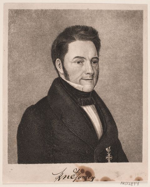 Editor: Here we have "Man in Black," an oil painting from the early 19th century, sometime between 1820 and 1840, by an anonymous artist. The man's intense gaze really stands out. How would you interpret this work from a formalist point of view? Curator: The formal elements are quite striking, wouldn't you agree? Note the artist's calculated use of chiaroscuro. How does the contrast between the dark background and the light falling across the man’s face guide your eye? Editor: It definitely emphasizes his face and that crisp white cravat, almost creating a focal point in the sea of black. Curator: Precisely. And consider the texture—or rather, the lack thereof. The artist achieves a smooth, almost porcelain-like surface, particularly on the face. What does this tell us about the artist's intention and technique? This, contrasted with the implied texture of the ruffled cravat. Editor: I suppose it suggests a focus on idealized representation, a kind of striving for perfection and it highlights their difference of class in dress, or… conveys something of that nature? Curator: Indeed, and if we consider the overall composition—the tight framing, the central positioning of the figure—these elements contribute to a sense of directness and perhaps a hint of the subject’s importance, as well as his control within the frame. Editor: That makes sense! Analyzing just the formal aspects really sheds new light on how to view this work. Thanks! Curator: My pleasure. Examining these technical elements is often the key to understanding the overall artistic intention.