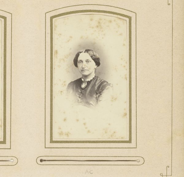 Editor: Here we have "Portret van een vrouw" by Friedr. Kuntze, estimated to be from between 1850 and 1900. It’s a photograph, a gelatin-silver print, with a lovely warm-toned, almost vintage feel to it. What stands out to you when you look at this image? Curator: I am drawn to the material process itself. Consider the labor involved in creating this gelatin-silver print in the mid-to-late 19th century. The glass plate negative, the meticulous darkroom work… Editor: Absolutely, I didn't think of it that way. Curator: Exactly. Each photograph required considerable skill and time. Then think about its accessibility. How many portraits were commissioned and how much did the subjects have to pay to get a photo like that taken? Editor: So, you're saying this portrait is as much about the economics and accessibility of photography at the time as it is about the sitter. Curator: Precisely. It moves the conversation beyond merely aesthetic or biographical interpretations. The paper itself, now aged and yellowing, becomes a document of its own history, its own consumption. Editor: That really shifts my perspective. I hadn’t considered the socioeconomic implications of early photography. Curator: Seeing art through its materials and production opens up new avenues for understanding the broader social and cultural context. Editor: I agree. Considering the labour and materials transforms how I perceive this seemingly simple portrait. It becomes a much richer object. Curator: It is a reminder that even the most seemingly straightforward image is laden with materiality and the traces of labor.