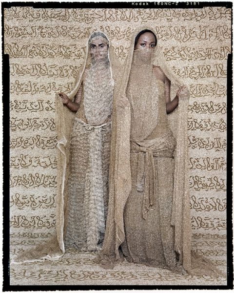 Editor: Lalla Essaydi's "Converging Territories #28" from 2004 is a striking photograph; almost sculptural in its presence. The figures draped in text-covered fabric are mesmerizing, and the overall tone feels…subdued, yet powerful. What do you see in this piece? Curator: I see a powerful commentary on the complex intersections of Islamic identity, gender, and cultural representation. Essaydi, through her lens, is challenging orientalist tropes, wouldn’t you agree? The women, covered in fabric inscribed with Arabic calligraphy, are simultaneously veiled and exposed, silenced, yet speaking volumes. Editor: It's interesting that you mention the writing on the garments. Does the text itself hold a specific significance? Curator: Absolutely. Traditionally, calligraphy is associated with male authority within Islamic culture. By covering the women, and the space around them, with this script, Essaydi reclaims that authority. It’s a subversive act, speaking to female agency within a patriarchal structure. She recontextualizes tradition, wouldn’t you say, using the visual language of the harem, typically a space of confinement and objectification, and transforms it into a space of strength and self-expression. Editor: So the act of covering becomes an act of empowerment, not oppression? Curator: Precisely. It's about reclaiming narratives, challenging stereotypes. Consider the composition itself – the repetition of figures, their gaze averted – creating a sense of collective identity and resistance. Essaydi makes us question our own assumptions about Muslim women, asking us to look beyond the veil, so to speak. Editor: I never thought about it that way. Now I see a multi-layered statement on cultural identity and gender dynamics! Curator: It’s a dialogue, a continuous re-evaluation. And art is a fantastic tool for that. Editor: Absolutely, thanks, this helped me deepen my knowledge a great deal.
