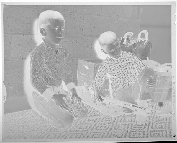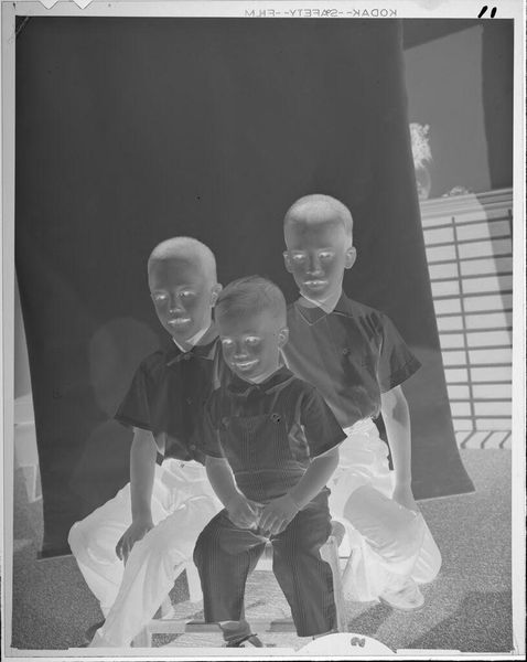 Curator: This is an intriguing silver gelatin print credited to Lucian and Mary Brown, titled "Untitled (portrait of three boys)." Editor: The reversed tones give it an eerie, almost ghostly presence. The boys' smiles seem frozen, fixed in time. Curator: Indeed. Considering the historical context of photography and its role in shaping perceptions of childhood, it's a window into ideas about identity. Editor: And perhaps the societal roles imposed upon these young boys? Their matching outfits suggest conformity, yet their individual expressions hint at something more complex. Curator: Absolutely, and this photograph becomes more than a mere portrait; it becomes a cultural artifact ripe for interpretation and societal critique. Editor: A potent reminder that images, even seemingly simple family photos, are always embedded within larger systems of power.
