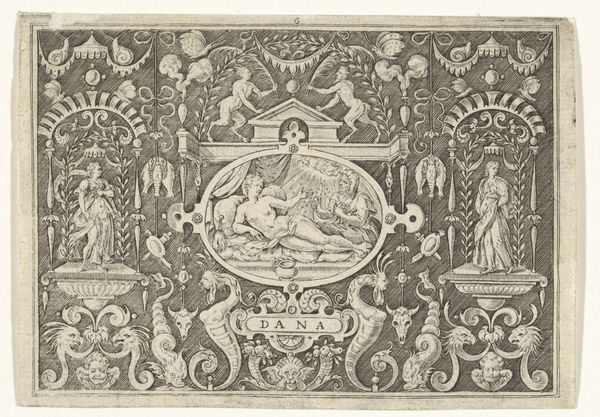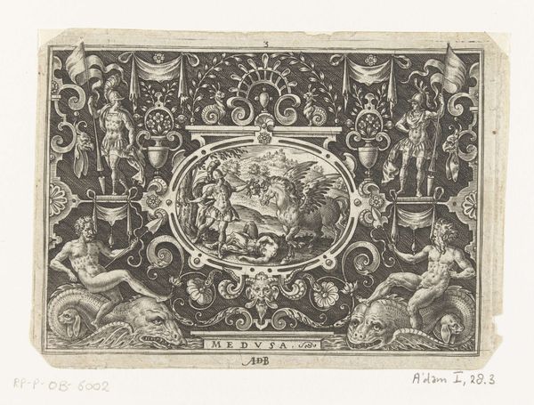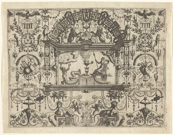 Editor: So, here we have "Architectuurfantasie met de val van Bellerophon," made sometime between 1565 and 1571 by Johannes or Lucas van Doetechum. It’s an engraving… and wow, it's incredibly detailed! It feels very ornamental, almost overwhelmingly so. What’s your take? How do you even begin to unpack something like this? Curator: You know, it hits me as a total Renaissance fever dream, doesn’t it? Like they threw a classical history book into a blender with a bunch of architectural diagrams and then added cherubs, just because. The central scene, Bellerophon falling from Pegasus, is tiny in comparison to all that wild ornamentation. What strikes me is the sheer exuberance—a kind of visual over-indulgence. Makes you wonder what they were *really* trying to say. Does the fall of Bellerophon serve as a kind of moral center to the image? Editor: That's a great question! I hadn't really thought about that, focusing so much on the... stuff *around* it. Curator: And what about that "stuff"? Those fantastical creatures, those strange architectural elements... Does it read to you as confident or anxious? Are we witnessing the celebration of human intellect through the mastery of form or a sort of fear that chaos lies at the edges of order? It might sound a bit heavy but prints like these, produced in multiples and circulated widely, really worked *hard*. Editor: Now I see more of what you mean; It isn't just a pretty picture. All these elements...they’re like clues! Curator: Exactly! Prints are amazing cultural artifacts because, for their time, they are easily replicated. What stories do you think these images were communicating to the people who would have experienced them? Editor: Well, this has certainly changed my perspective. It’s more than just a historical curiosity. It's like a coded message from the Renaissance! Curator: Precisely! Next time, try approaching these images like you're attempting to translate them. Consider the language used by its creator and imagine how its original audience may have perceived it. Then you might find a surprising and meaningful point of access to this rich world of old engraving.
