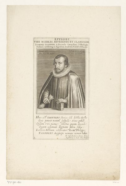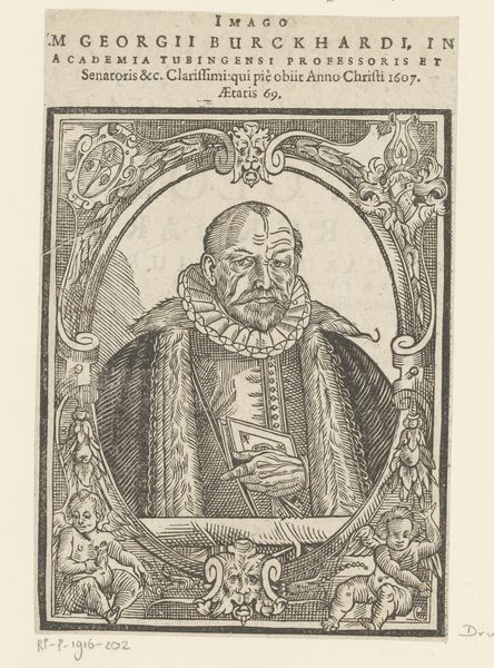 Curator: This is a print from around 1597-1599, currently residing in the Rijksmuseum. It's entitled "Portret van Hartvicus Smidenstet" and is a Mannerist engraving on paper by Robert Boissard. Editor: It has an incredible intensity for a small work. The texture practically vibrates, doesn’t it? All those fine, closely-wrought lines building up tone and depth, particularly in his fur-lined robe and that impressive ruff. Curator: Absolutely. The Mannerist style favors that very dense, detailed treatment. But notice how Boissard uses the line to create distinct zones of visual interest? The face, of course, framed by that ruff, but then your eye is drawn to the book in his hand, almost a miniature of himself in its rectangular solidity. Editor: And I read the book as key to understanding him. This is not merely a portrait of an individual, but a representation of his learned status. His book, his attire, even the inscription that surrounds him, which describes him in Latin as both Philos and Orator: everything speaks to Smidenstet's position within the intellectual community. The elaborate borders, teeming with floral and heraldic imagery, serve to amplify his elevated status. Curator: Precisely! Look closely, and you'll see the inscription below his image claims him as "another Amphion and Linus", figures in classical mythology known, respectively, for building Thebes with music and being the lyre-playing tutor of Heracles. The image isn't simply capturing a likeness, it’s making an argument. Editor: I am curious about the oval format too, it really draws you into the frame itself which adds to its power as an object in itself, I imagine it being passed as something of immense value. Curator: Yes, it seems to be of high regard. Thank you for highlighting aspects of "Portret van Hartvicus Smidenstet” that go beyond surface aesthetics. Editor: The image now means so much more.