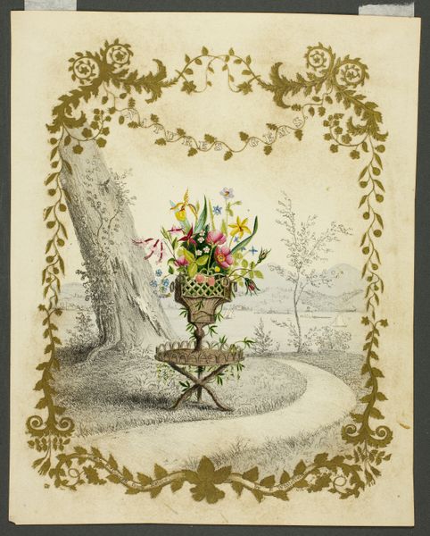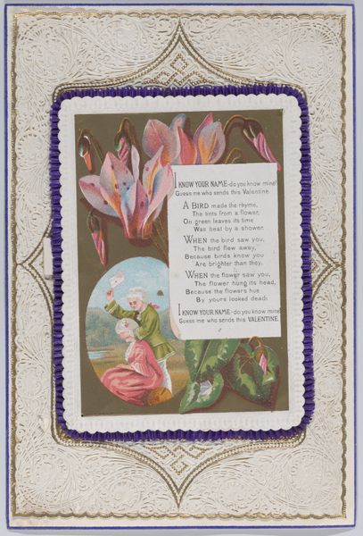 Curator: Let's turn our attention to a delicate work from the late 19th century. This "Valentine - Mechanical - pulls open to reveal elaborate scene," made sometime between 1870 and 1880, is currently housed here at The Met. Editor: It has such a quaint, old-world charm about it, doesn’t it? All frills and flourishing roses. I can almost smell the perfume it must have been stored with. Curator: Indeed. The composition relies heavily on symmetry and the use of decorative elements. Notice the framing, how it uses scalloped edges and repeating floral motifs to create a contained, romantic tableau. The use of watercolor provides a soft, ethereal quality. Editor: Absolutely, and I’d argue that those artistic choices directly correlate to the societal constraints and expectations placed on women during this era. Valentine's cards like these become a carefully constructed space for emotional expression in a world that often denied them direct agency. Curator: An interesting perspective. I find it particularly intriguing how the unknown creator blends drawing, print, and a mechanical element, all contained within a small object intended for intimate exchange. The tassel adds an almost tactile dimension to the visual experience. Editor: And that "Heaven bless you, day and night, Fill your heart with pure delight" written at the bottom… Isn't it just dripping with saccharine sentiments that simultaneously reflect and perhaps yearn to transcend Victorian ideals? Curator: Perhaps. Regardless, it seems to fulfill its function, employing specific aesthetics associated with Romanticism in an almost diagrammatic way. The structural balance evokes a feeling of order and controlled emotion. Editor: I agree, but wouldn't that "controlled emotion" then speak volumes about the cultural climate surrounding relationships at the time, hinting at the passions kept private and those publicly performed? It serves as a poignant reminder of the power dynamics always at play. Curator: I hadn't considered the work through that particular lens. A point well taken. Editor: Examining art this way enriches not only our understanding of bygone eras but of contemporary discourse.