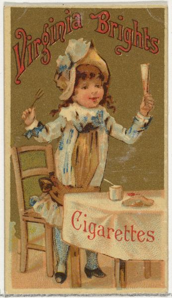 Editor: Here we have "From the Girls and Children series (N64) promoting Virginia Brights Cigarettes for Allen & Ginter brand tobacco products," dating back to 1886. It's a colored-pencil print. I'm struck by the child’s attire and how incongruous it seems in relation to the product being advertised. How do you see this piece functioning within its historical context? Curator: It’s fascinating when we consider the confluence of labor, commodity, and representation in something like this. A print such as this would have been mass-produced, included in cigarette packs to entice consumers, depicting children, perhaps as cooks or bakers. But we have to ask: who was producing these images? What were the conditions of their labor, and what were they paid? Editor: That's a perspective I hadn't considered. I was mainly thinking about the message being conveyed but thinking of labor behind is very important. What materials were commonly used in such prints? Was there a specific printing method favored? Curator: Usually, these would've been chromolithographs – a relatively inexpensive color printing process at the time. The availability of such technologies, combined with the demand for advertising materials, spurred a massive industry. Think about the socio-economic status of both those consuming and creating these images. How does that power dynamic play into what's represented, or rather, what's *not* represented? Editor: So it's not just the image itself, but the entire production chain, from the pencils used to the printing press. It’s interesting how even seemingly innocuous images reflect broader material and social realities. Curator: Precisely. We examine not only what is depicted but *how* it's depicted and *why* it's depicted that way. That's the crucial starting point. I hope it was useful! Editor: Definitely! I'll definitely look at things differently going forward, thank you.