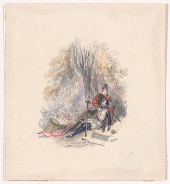 Curator: What a delicate scene. Frank Howard created this illustration design, “Illustration design for "The Economy of Human Life"”, in 1834, and it now resides here at The Met. He worked with watercolours, coloured pencil, and likely used a printmaking process as well. Editor: It has a slightly dreamlike quality, doesn’t it? The soft watercolor washes and the composition…the way the figures are placed creates a strong sense of narrative but with very delicate colours. Almost as though filtered through memory. Curator: I agree. The narrative is what truly interests me. Look at the dynamic between the mounted figure and the one struggling on the ground. This artwork really allows us to consider the social power structures that were pervasive at that time. A mounted and armed rider versus a nearly nude figure, with axe. What is being portrayed, really, is class inequity of the period, but also a relationship with labour and access to land or resources. Editor: Precisely, it’s interesting how he's chosen to articulate that class divide. The texture in the horse's mane compared to the rather more muted shading used to delineate the suffering man. The sharp rendering of the bridle suggests restraint and authority, against the desperation of the man reaching upward. Curator: Exactly! And thinking about the title – "The Economy of Human Life" – Howard is possibly drawing our attention to how society assigns value to different lives, based on economic status and their placement within a certain class strata. Who has the right to resources, to agency, to even a basic standard of living? The seated figure in command, high above the impoverished. Editor: It also offers us a glimpse into Romanticism. The rather grandiose landscapes and emphasis on heightened emotional states were clearly crucial aspects to artists like Howard at this moment. The details, while softened by the watercolour medium, are still very descriptive. Curator: And what stories these images carry forward. To consider labour, class, access…what questions these compositions bring forward to us. Editor: Indeed. There's a timeless quality to Howard's romantic piece. One leaves with far more questions than answers about both its technical merit and underlying social themes.
