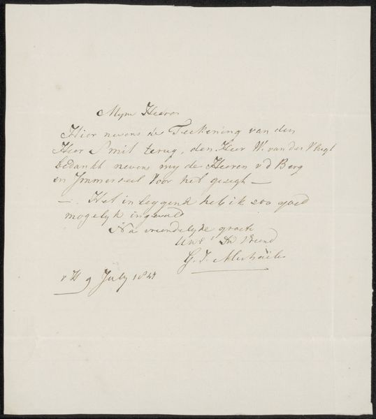 Editor: Here we have Ernest Hébert's "Aantekening," possibly from 1855, a note rendered in ink on paper. The script itself is lovely, even if I can't decipher a word! I feel a sense of intimacy, like I'm peering into the artist's private thoughts. What catches your eye about this piece? Curator: Intimacy, precisely. Imagine Hébert, pen in hand, capturing fleeting thoughts, perhaps on a sun-drenched Italian hillside – he mentions "le paysage du soleil." It speaks of a romantic spirit, yearning for connection and… perhaps a touch of melancholic reflection, what do you think? Is it sunshine or shadows we are seeing? Editor: It's both, actually! The bright paper contrasting with the dark ink creates that tension. Do you think it’s purely personal, or was Hébert considering a wider audience? Curator: A delicious question! The practiced hand suggests he's accustomed to writing, but the personal reflection whispers that perhaps it wasn’t originally intended for public eyes. Imagine finding this tucked away in a forgotten journal! Maybe an early, perhaps discarded note for what later become an iconic salon artwork. That ambiguity is part of the work’s enduring charm. Editor: I never thought of it that way! Seeing it as a discarded beginning, adds a whole new layer. Curator: Exactly! The beauty is in those whispers and what ifs. Perhaps the art is not just in the final picture but the journey, captured in that delicate handwritten annotation, the artistic genesis.
