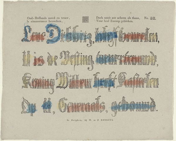This colorful drawing made by Lutkie & Cranenburg spells out a moral message with playful figures. Each letter in the Dutch phrase "Mensch leef vroom en goed eert uwen vader en uw moeder"—"Man, live piously and well, honor your father and your mother"—is formed by small human figures in various poses. This animation of text reminds me of the tradition of illuminated manuscripts, where letters were not just carriers of words but also vessels of images, filled with religious or moral meaning. Here, the artist transforms the act of reading into a visual spectacle, demanding both intellectual and visual engagement. It reminds me of the ancient alchemic drawings, full of hermetic symbolism and hidden meanings. The phrase could be seen as a microcosm of societal values passed down through generations. It is fascinating how this simple maxim touches upon the complex interplay between individual conduct, religious observance, and familial ties.