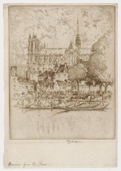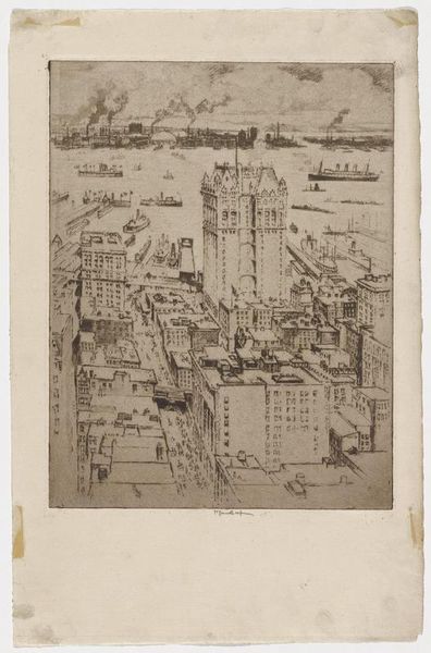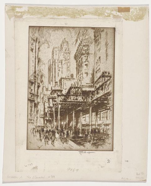 Curator: Looking at this etching, Joseph Pennell's "Trinity Churchyard," completed in 1921, I feel a kind of melancholy beauty. It's incredibly detailed but soft at the same time. Editor: Yes, the sepia tones give it a definite nostalgic feeling. The towering buildings surrounding the church seem almost to swallow it, which speaks volumes about power dynamics, doesn't it? The way capitalism and modernity loom over even the sacred. Curator: Absolutely. I’m always drawn to the people in the foreground, though. The tiny figures on the benches invite contemplation, right in the face of the urban frenzy all around. It’s like finding a moment of peace within a whirlwind, a reminder that even amidst monumental architecture, life goes on at a human scale. It reminds me of finding my own quiet corner in the city. Editor: I think you’ve hit on something key. Pennell often portrayed the tension between tradition and progress, and it really is at the heart of this work. The gothic revival architecture of Trinity Church itself, surrounded by early skyscrapers, it's this incredible visual representation of the changing urban landscape of New York. This image serves as a critique of the often brutal processes of modernization. Curator: It’s so evocative. You can almost feel the hushed atmosphere of the churchyard amidst the cacophony of the city. His technique—the intricate, almost delicate etching lines— adds a layer of quiet contemplation. Pennell really captured not just a place, but a feeling, a moment in time. I see almost like a haiku: stark juxtapositions inviting reflection. Editor: Agreed. It's an intersection, quite literally, between architectural form and social space. It asks us to consider how our environments shape our experience, and the stories that are embedded within them. Are these churchgoers seeking sanctuary, or simply weary workers seeking a moment of respite? Pennell doesn't offer easy answers, he lays bare a society in rapid transformation. Curator: Ultimately, Pennell provides an important historical marker that still manages to echo through time. It is a glimpse into a city’s past—a beautifully wrought question mark in visual form. Editor: Yes, a stark but visually poetic meditation on faith, progress, and the enduring human search for solace within an ever-evolving world.