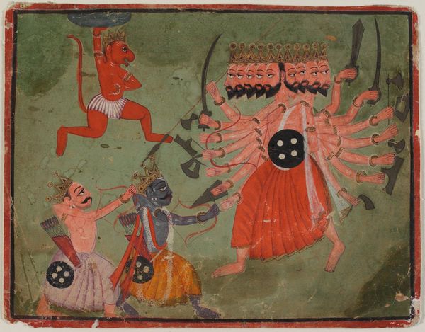Editor: Here we have an intriguing piece, "Composite Elephant with Erotic Imagery," attributed to Chokha. It's painted on paper, with watercolor, and quite small. What first strikes me is the literal layering of bodies, a very human elephant. How do you interpret its symbolism? Curator: This composite creature, formed of entwined bodies, speaks volumes about cultural memory. The elephant, a symbol of royalty and strength in India, is here transformed. Do you notice the erotic imagery interwoven? Editor: Yes, it's quite overt. Is it meant to be celebratory or something else? Curator: Consider the context. Composite creatures often represent power, but also transformation. The erotic element suggests fertility, life force. It's a complex statement, isn't it? A playful yet powerful image. Editor: It is powerful. I never considered eroticism as an expression of power. Curator: Indeed, the image's lasting impact resides in how it continues to challenge and provoke us.
