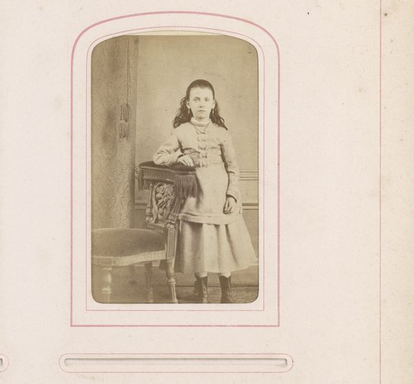Curator: This is a portrait photograph, titled "Portret van een meisje," which translates to "Portrait of a Girl." The image, created between 1892 and 1900, is by J. Diamant, utilizing the photography medium, in a portraiture style. Editor: I’m immediately struck by the formality and stillness in this image. The girl’s dark, polka-dotted dress, accentuated by that stark white lace collar, hints at a meticulously constructed social tableau of the time. There's a sort of rigid expectation, a carefully maintained facade. Curator: Yes, the material elements contribute significantly. Consider the photochemical process involved in creating this type of photograph; the way the light would have been manipulated. The clothes, especially her dress are also relevant to that process: fabrics that held up in photographic contexts of that era were heavily traded as a result of photography. Then, of course, there's the labor involved in her clothing design. The lace collar especially is highly crafted. Editor: Exactly! And we should acknowledge the performative aspect as it pertains to gender and childhood in the late 19th century. Look at her posed with a small basket of flowers. It is very suggestive. Was it acceptable or commonplace to use a child in this manner, and how do such portraitures frame her existence, her position in society? How complicit was this child in its making, being as the photograph features her form and likeness? It makes you wonder. Curator: I agree. And let's not forget the economic element. Having one's portrait taken during this period, involved time, studio space, and resources like set-decoration (consider the marble-top pedestal) as an affirmation of one's status. How photography contributed to material culture of its era needs to be acknowledged here too. Editor: The fact that this is a photographic "portrait" is key here; portraiture historically reserved for nobility is now accessed through relatively inexpensive and readily available new technology. What sort of statement did this accessibility imply regarding middle-class family values, perhaps? Curator: These details matter! Analyzing the photograph like this shows just how complex the relationship between commerce, society, technology, and representation was at this time in history. Editor: Definitely; examining how art reproduces or confronts existing political power structures opens us to understanding its historical moment better. This conversation offers more than just appreciating art, it enables us to dissect social constructs and engage critically with photography’s profound historical implications. Curator: It does. Through acknowledging both the visual and the material realities of this image, our appreciation becomes layered.