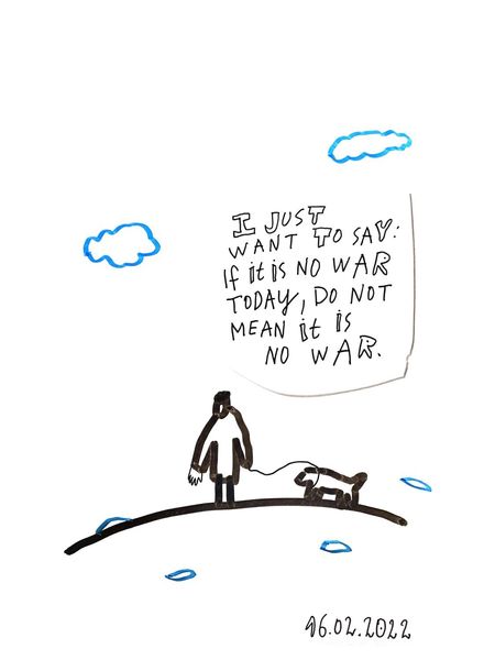 Alevtyna Kakhidze made this drawing on April 10th 2022 in the Kyiv region, using a limited palette of black, blue, and red, as if distilled from a child's crayon box. The image feels immediate and raw, like a thought that has been quickly jotted down. There's a kind of urgency to the marks. Look at the way she's scrawled the words, how the lines wobble and break. The red blush on the figure’s face, it's not just a color, it’s an emotion, a physical manifestation of shame and vulnerability. The overall texture feels delicate, almost fragile, like the paper itself could tear at any moment. This piece reminds me a little of work by Philip Guston, especially the later paintings, in that they share a similar directness and emotional honesty. Kakhidze has created an image that invites us to feel alongside her, to share in her moment of reflection. It's a reminder that art doesn't always have to be polished and perfect; it can be messy, raw, and deeply human.