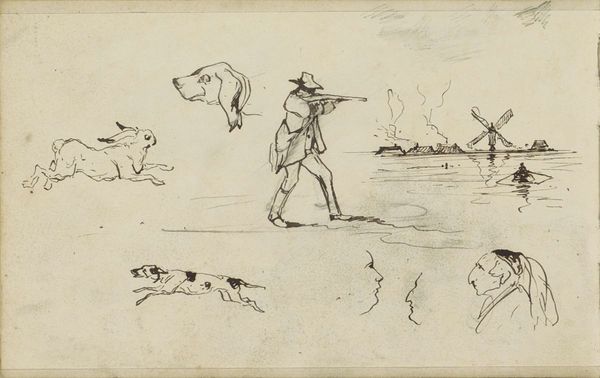 Editor: This is a fascinating sheet of sketches by Johannes Tavenraat, titled 'Schetsblad Kleef 1853', created in 1853 using pencil. It's really captivating, a mix of figures, landscapes, and portrait studies all on one page! I am immediately drawn to the sketch of the shepherd with his dog, but I'm curious, what does this collection of drawings say to you? Curator: Well, what strikes me is the very act of sketching itself as a cultural practice of observation. Consider the social role of art in 19th century Holland, a period of relative peace but also immense social stratification. What do these fragmented sketches, almost like visual notes, tell us about the artist's position and interests within that society? Editor: That’s interesting. I was just looking at the individual drawings. But the point you raise, the fact it is a collection, a sketch-pad in fact, how might the artistic institutions of the time respond to that as opposed to a ‘finished’ piece? Curator: Exactly! Sketchbooks weren't typically displayed publicly then. They were tools for the artist’s own development. Think about it: How does displaying a sketchbook change its meaning, its value, in a museum setting today? Are we valorizing the ‘process’ over the ‘product’? Are we granting privileged access to the artist’s mind? Editor: I suppose that’s what strikes me; how the piece being displayed encourages speculation on artistic interpretation. I see the realism, but its arrangement suggests a lack of formal commitment to it. It is about the method. I didn't think of the politics though! Thank you! Curator: And it's through these kinds of observations and historical considerations that we deepen our appreciation for these images and how their social role transforms with time and context.