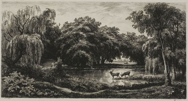 Curator: This etching from around 1860 by Charles-François Daubigny is called "Pig in an Orchard". It's a deceptively simple scene. Editor: Simple, but… melancholic? There's something about the monochromatic palette and the pig's posture that evokes a feeling of subdued stillness. A landscape weighed down. Curator: Daubigny, known for his contributions to the Realist movement, here demonstrates a move towards capturing authentic rural life through detailed depictions of form and structure. His approach is meticulous—observe the density of lines which he employs to model shadow and depth. It seems less about an objective "reality," though. More about conveying something felt. Editor: You see that tiny house practically swallowed by vegetation? It's wonderfully unnerving. Like something out of a forgotten fairytale, perhaps reflecting broader themes about nature reclaiming what civilization leaves behind? The pig almost seems oblivious, or perhaps resigned to the encroaching wilderness. Curator: Precisely! He was quite innovative, using the etching process in novel ways to create painterly effects. He played with texture and light to elevate everyday scenes—he wasn't just documenting farm animals. Notice how he employs short, broken lines to describe the textures of the foliage in the foreground. It gives everything such a unique tactile quality, you feel like you could almost reach out and feel the grass. Editor: It really does transcend a simple pastoral scene. It invites me to ponder themes of mortality, the brevity of life, or how humans impact the land around us. Perhaps he felt a connection to his subject: Daubigny also etched words "un Cochon de propriétaire qui ne fera de bien qu'après sa mort." Curator: Yes. In this subtle composition, Daubigny prompts reflection through art, leaving one with a gentle, poignant aftertaste of the inherent ephemerality of all living things. Editor: An orchard seen with remarkable pathos.