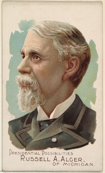 Editor: This lithograph print, "John Sherman of Ohio, from the Presidential Possibilities series," created in 1888 by W. Duke, Sons & Co., presents a somewhat idealized portrait. The delicate blending of colors, almost impressionistic in style, gives the figure a soft, almost ethereal quality. What do you make of the piece? Curator: The primary element to observe is how the print structures our perception of John Sherman through calculated aesthetic choices. Note how the artist employs soft gradations of color to delineate the planes of the face, almost sculpting the figure out of light and shadow. The hazy, indistinct background, a field of pale blue stippling, serves to push the subject forward. What effect does the artist accomplish here? Editor: It makes him seem very present and important, even though the background isn’t clearly defined. The lack of harsh lines gives it a gentle, approachable feel. Curator: Precisely. Observe also the considered use of line. The sharp delineation of the suit contrasts significantly with the soft rendering of the face. This juxtaposition guides the viewer's eye, moving from the formal attire—signifying status and authority—to the more human, expressive qualities of the face. Are we given any psychological insight here? Editor: I think the effect is more symbolic than literal. It conveys a sense of trustworthiness, perhaps. It definitely presents him in a positive light. The details seem carefully chosen to project a particular image, in this case perhaps that of an ideal presidential candidate. Curator: Precisely, and one might extend that reading to consider the overall composition: a stable, pyramid-like structure formed by the subject's head and shoulders, imbuing him with a sense of gravitas and permanence. The interplay of these visual elements, I suggest, constructs a powerful message beyond mere representation. Editor: Seeing how the formal elements work to create that impression changes my understanding of its purpose. I appreciate the closer look at composition and colour. Curator: Indeed, analyzing these intrinsic qualities offers a deeper appreciation. By recognizing visual tools, one gains enhanced interpretive abilities, refining perception beyond face value.