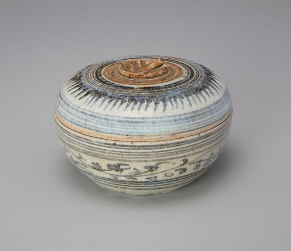 Editor: So, this is a water jar crafted by Ogata Kenzan between 1695 and 1715. It's currently held at the Met. It's… unexpectedly charming. A simple ceramic jar, but adorned with these almost naive landscape scenes. How do you interpret this work? Curator: The key is in understanding the material conditions and production. This isn't just a functional object; it represents a dialogue between "high" art, as represented by painting traditions evident in the landscape depiction, and "low" art of functional pottery. Editor: Could you elaborate? Curator: Kenzan was from an artistic family. Think about the labor involved – from the potter shaping the clay, the grinding and application of pigments, to the artist who then paints the scenes. Kenzan, coming from privilege, is making these functional objects into artworks that have painting on them, but also would have been sold or given as a gift to the privileged of the time. It blurs the lines. What purpose did this object have and how much did social status impact what a normal utilitarian item would cost. It all connects to larger systems of production and social relations. Editor: So you're suggesting that it challenged the status quo by elevating the mundane, forcing us to consider labor and how things get made and who gets them. Curator: Precisely. By imbuing a functional object with artistic merit, he challenges conventional boundaries. He makes us question our preconceptions about art, class, labor, and consumption in early 18th century Japan. Editor: I guess I was looking at it as just a pretty jar, but it’s so much more layered when we consider it in context. I’ll have to remember to think beyond the visual next time and start to consider the forces that create it and put in motion how something gets distributed in society. Curator: Exactly. We're looking at more than just a water jar; we’re looking at a material object embedded in a social, political and economic environment.