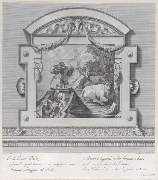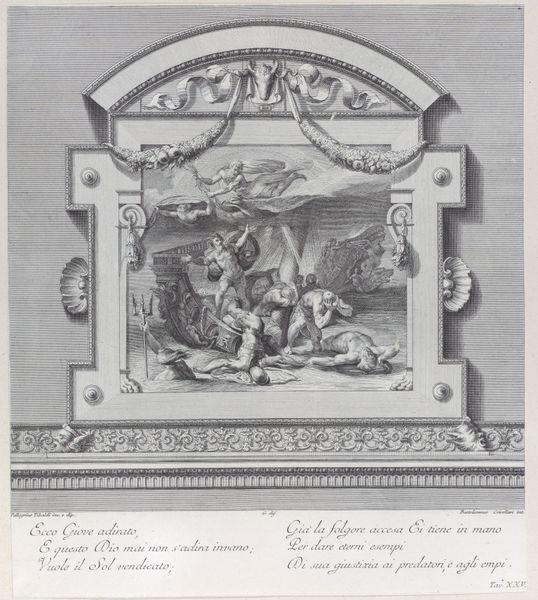Editor: So, this is Bartolomeo Crivellari's "Plate 27: Ulysses received by Alcinous king of Phoeacia and his Queen Areta after his shipwreck," an engraving from 1756. There's a very staged feel to it, almost like a theater production. What historical narratives do you think this piece is trying to tell? Curator: Indeed. Consider how this engraving functions within 18th-century European thought. It is a retelling of Homer's *Odyssey*, placing it in a tradition deeply intertwined with power structures. How does Crivellari depict Ulysses, a shipwrecked traveler, kneeling before royalty? Is this simply illustrative, or does it reflect and reinforce the hierarchical structures of the time? Editor: I see your point. It’s more than just depicting a scene; it's about the relationship between the individual and authority. Curator: Precisely. And what about the composition itself? The rigid lines, the deliberate placement of figures—they all contribute to a sense of order and control, reflecting the values of academic art and baroque styles of the period. It invites us to consider the artist's own social positioning and what ideologies are being reproduced here. Who gets to tell this story, and whose voices are marginalized? Editor: I didn’t consider the artist’s own social context so directly before. That adds another layer of interpretation. How much does knowing the story of The Odyssey influence our reading of this image? Curator: Immensely! It predetermines, to some degree, how we understand concepts such as "hero," "home," and "hospitality" when thinking about our world. How might this narrative uphold specific gender roles or normalize certain cultural exchanges of its day? Does Ulysses really look thankful to you, or somewhat forced into his pose? Editor: It almost feels like he’s forced to perform gratitude. I guess art isn't just about the visual; it's about unpacking all these social dynamics, too. Thanks! Curator: Absolutely! It’s about interrogating the visual, and what the dominant narrative privileges—or silences. It is our duty to remember history.