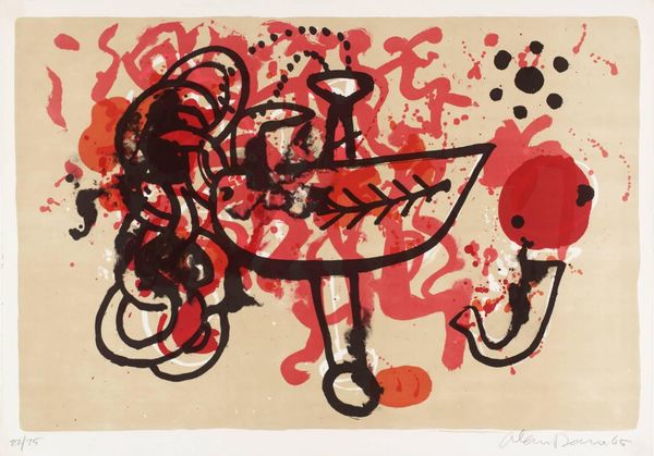Editor: Alan Davie’s "Celtic Dreamboat II," created in 1965, is quite striking with its bold lines and abstract figures. The stark contrast between the black and green shapes gives it a playful yet slightly unsettling mood. What do you make of the formal elements in this print? Curator: The interplay between line and shape is indeed critical here. Observe how Davie utilizes thick, almost crude, lines to define forms, juxtaposed with areas of flat color. The composition relies on an asymmetrical balance, creating a dynamic tension across the picture plane. Does this tension speak to you? Editor: Yes, it does. It's almost like a visual argument between order and chaos. I see it now. Thank you. Curator: Precisely. The beauty of formal analysis lies in recognizing how these elements contribute to the work's overall impact and potential meaning.