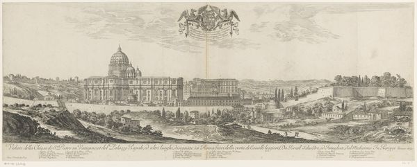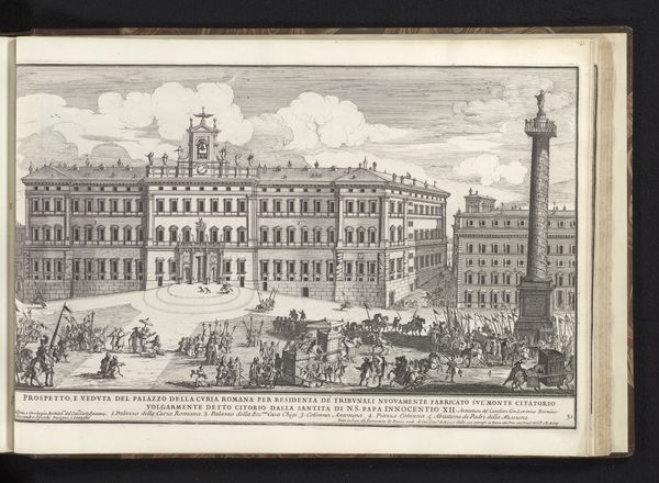 Curator: Before us is a print entitled "An Album of Prints of the Roman Festival of the Chinea," created anonymously sometime between 1722 and 1749. It's an engraving, dense with detail. Editor: My first impression? Organized chaos. Look at the linear perspective converging on the architectural structure in the background, but then observe all the swirling human activity in the foreground, breaking the implied frame! It almost feels like a stage set. Curator: Absolutely, that interplay is essential. Notice how the architecture itself is theatrical—the terraced structure suggesting a stage, replete with allegorical figures atop it. The light and shadow created by the engraving technique further enhance the drama. Editor: And think about the social context: The Chinea festival was essentially a tribute to the papacy. Each ambassador had a dedicated stand within a larger, elaborate space created ad hoc within the city to present tribute in form of white chinea horses to the Pope. The festivity promoted Rome and reconfirmed social cohesion and political influence within the Papal States. These weren't simply celebrations; they were performances of power. Curator: Precisely! Consider how the artist directs our gaze, structuring our experience of the piece through meticulously rendered forms. The engraving utilizes contrast to pull forward figures and certain decorative parts of the architectural components that may hold a key or a narrative clue. Editor: The figures in the foreground appear engaged in processions or other ceremonial actions. Their costumes indicate status, reinforcing social hierarchy, as they play out on what we've already observed, is a real stage of power and reverence. Curator: In regards to composition, it’s intriguing how the symmetry of the architecture clashes subtly with the asymmetry introduced by the arrangement of the figures below, setting up an appealing tension within the artwork itself. Editor: Reflecting on it, this image encapsulates the baroque era: ornamentation meets propagandistic messaging, wrapped within this fascinating city. What a lens through which to consider this time! Curator: A testament to the power of lines and shading in conveying not only physical space, but also complex cultural narratives.