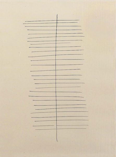 This untitled drawing was made by Lothar Charoux using ink on paper, and it’s like looking into a world of pure process. The repetitive, diagonal lines create a kind of hypnotic rhythm, but it's the imperfections that really grab me. See how the lines sometimes wobble or thicken? It’s the artist’s hand, the slight tremor, the human element breaking through the rigid structure. It reminds me that art is never about perfection, but about the beauty found in the doing. The density of the lines varies, creating subtle shifts in tone and texture. At the top the paper peeks through, creating a kind of shimmering effect that makes the image feel almost alive. It's like Agnes Martin’s obsessive grids, but with a raw, unpolished edge. Ultimately, it’s this tension between order and chaos, control and accident, that makes this simple drawing so compelling.