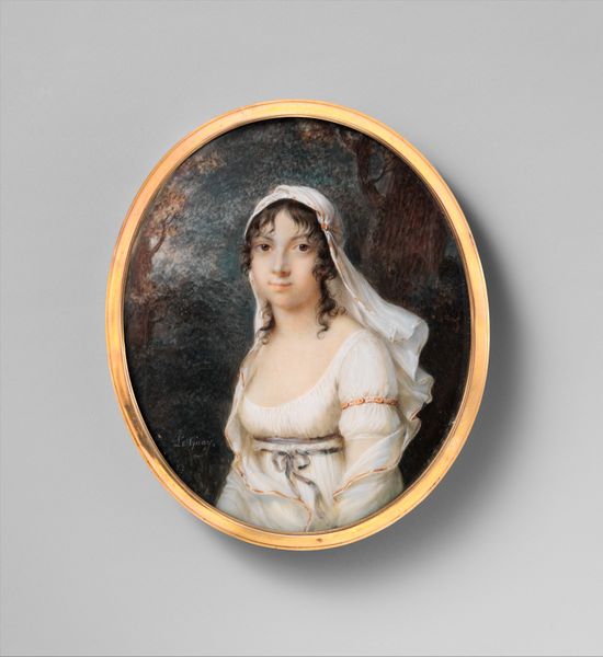 Louis-Marie Autissier painted this miniature portrait of Jonkvrouw Johanna Cornelia Mollerus, likely in the late 18th or early 19th century. Consider the social status and gender expectations of the time. Johanna, as a noblewoman, occupied a privileged position, yet she was also subject to the constraints placed upon women in that era. The demure pose and delicate features in the portrait reflect the ideals of feminine virtue and beauty that were highly valued in aristocratic circles. Notice also how the artist employs a refined technique to capture the texture of her skin and the details of her clothing and jewelry. These artistic choices convey Johanna's affluence and social standing. The jewelry, especially the vibrant coral necklace and earrings, draw attention to her. These items were luxury goods, and their inclusion underscores the family's wealth and status. This portrait then is not just an image of an individual, but also a document of class, gender, and the performance of identity within a specific historical context.