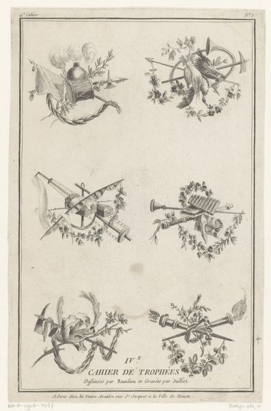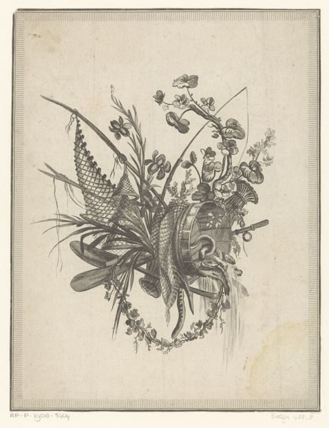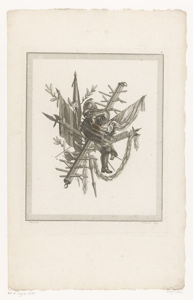 This is Pierre Gabriel Berthault's "Jachttrofee," an engraving that presents us with a celebration of the hunt, its symbols rendered in meticulous detail. Observe the boar’s head, the hunting horn, and the quiver of arrows. These aren’t merely objects; they’re totems of a primal interaction between humanity and nature. This arrangement echoes motifs found across cultures, where the spoils of the hunt are displayed as signs of prowess and dominance. Think of the ancient Roman triumphs, where conquered beasts and trophies paraded through the streets, signaling victory. The boar, in particular, carries a potent charge. In Celtic traditions, it symbolized bravery and ferocity, yet here, it’s rendered passive, a trophy. This taming of the wild resonates deeply, touching upon our own subconscious desires to control and conquer. The image, therefore, isn’t just a depiction, but a powerful expression of our complex relationship with the natural world, a relationship that continues to evolve as it resurfaces time and time again.