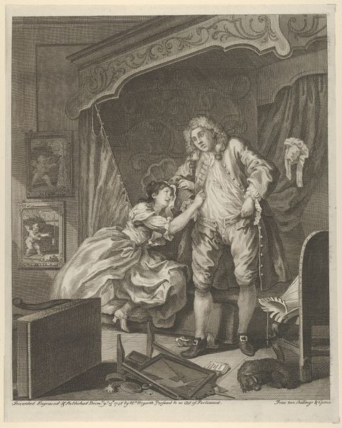 Curator: The shadows dancing on the wall… the soft light illuminating the central figure. The composition of this print immediately captivates. Editor: Indeed. And when we consider its title, "Origin of Painting," and that it was produced sometime between 1620 and 1670, it becomes evident that we are exploring a moment in art history that attempts to define itself by looking to, or even inventing, a past that justifies current social structures. Curator: I'm struck by the technique itself – the crispness of the engraving that allows for such detail. Note the careful rendering of the fabrics, the play of light on the skin. These formal elements elevate what might otherwise be a simple genre scene. Editor: It's also essential to acknowledge what the artwork does *not* immediately show. Where are its social and economic conditions, the structures of patriarchy, nobility, and classism it upholds and celebrates? To what extent is this “origin story” serving to erase those marginalized during its making? Curator: The very act of portraying silhouette-making itself as an act of high art—what does that mean for other forms of craftwork typically considered the provenance of women in the domestic sphere? Editor: The artist is Jean Ouvrier, so this is a white male artist taking control of a popular trend for the upper class and putting his stamp of approval on it. What makes this endeavor “art”? Whom does this artwork honor? It appears it is dedicated to Monseigneur the Prince Palann des Deux Ponts, and to “son e Altesse Serenissime.” Curator: And what does it suggest about representation and identity at the time? I think, given that silhouettes can stand in for someone, it could represent that individuals of note at the time were willing to give up a level of representation for one they could control themselves. Editor: Or that having portraits of notable individuals allowed the nobility to show off the “scalps,” in a way, that is a collection of images of subjects under their power and gaze. Curator: These insights invite us to further decode the layers of meaning embedded in it. Thank you. Editor: And thank you; this work pushes us to consider these layers with urgency.