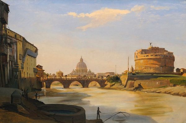 Curator: Before us is Frank Duveneck’s “The Bridges, Florence,” an oil on canvas created around 1880. What strikes you first about this piece? Editor: There’s a prevailing stillness. The earthy tones evoke a certain somberness, yet there's life implied by the presence of figures on the bridge. Curator: Precisely. Note how Duveneck deploys a restricted palette, a symphony of browns and muted grays, punctuated only by the pale reflections in the water. This monochromatic treatment is a formal device that focuses our attention on structure. Editor: But the restriction also speaks to the social conditions. What narratives are suppressed through this aesthetic choice? What of the working class in the city at this time? This isn't just an arrangement of forms; it is about who has the privilege to be seen and remembered. Curator: Consider the dynamism, despite your claim of stillness. The artist directs our gaze masterfully. The bridge serves as a compositional spine, balanced by the verticality of the distant tower. He is orchestrating how the eye travels through planes. Editor: Yet, isn't there a kind of flattening, too? The depth isn't convincing, which I find very evocative, not so much of place, but of how we build narratives of place and whose stories get obscured. It appears less interested in Florentine reality, than a projection of romanticised cityscapes palatable to specific patrons, at the cost of others. Curator: That perspective carries weight, however, his loose brushwork aims to suggest movement, it’s visible upon close examination in the water and sky. These flickering strokes create a sense of atmosphere and fleeting time. Duveneck seeks to capture something less fixed. Editor: A perspective of that era, to be sure. Though to see it as simply "capturing the ephemeral" feels like ignoring questions regarding what and whom he leaves out to prioritize painterly gestures and market demand. How do his choices influence historical narratives? Curator: Food for thought. This painting remains, after all, a complex object. Editor: Exactly. It compels us to ask the difficult questions.