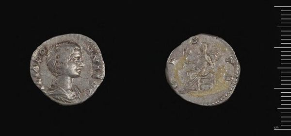 Curator: Look at this Roman coin, a denarius featuring Julia Maesa. It’s a small silver disc, really, but holds so much history. Editor: The way light catches its worn surface is so evocative, isn’t it? It feels like holding a little piece of a forgotten world. Curator: Absolutely! Consider the labor involved in extracting the silver, refining it, and then striking the coin. This was real work! Editor: And Julia Maesa herself! To have your likeness on currency...imagine the power, the weight of that symbolism. Curator: Coins like these weren't just money; they were propaganda, instantly accessible to everyone. A portable statement of authority. Editor: You know, it's strange to think this coin was someone’s everyday item. Now it's here, whispering stories from the past. Curator: A tangible link, indeed. Makes you wonder about the hands it passed through, doesn't it? Editor: Exactly! A small thing, really, but charged with the flow of history.