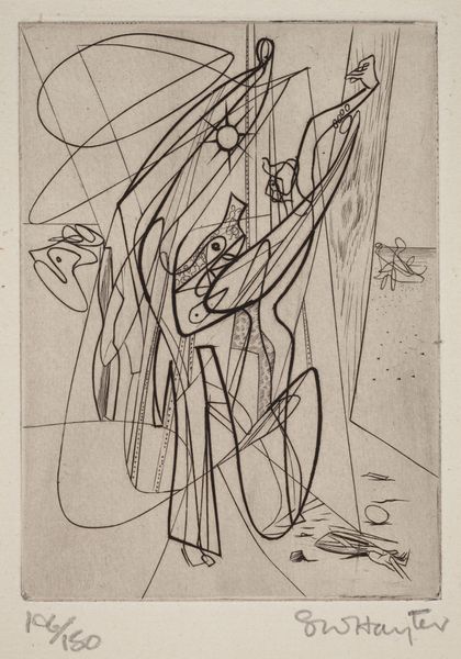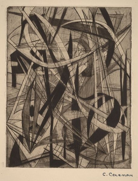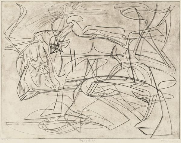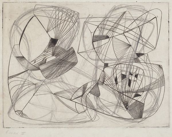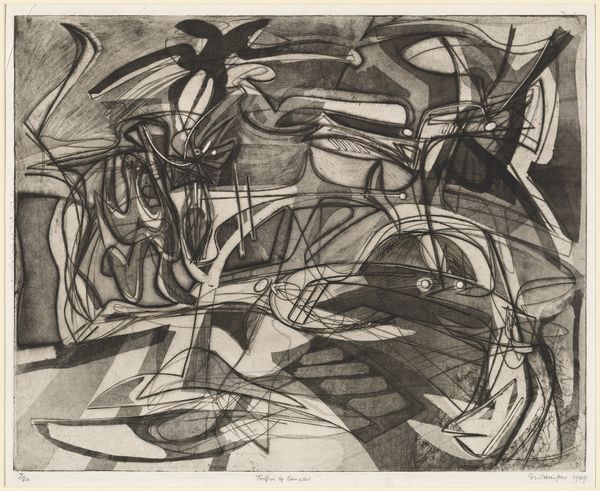 Editor: Here we have an Untitled piece, a print made using etching, engraving, and ink by Judith Rothschild, circa 1940s. It's an abstract composition dominated by swirling lines and stark geometric shapes. The frenetic energy of the lines is softened by the almost ghostly quality of the gray ink on paper. What can you tell me about this artwork? Curator: Looking at this "Untitled" print, I am immediately struck by its visual language that emerged in the context of social upheaval. The period when this piece was made, the 1940s, was a time of significant global conflict and societal transformation. Consider how that chaos, that desire for something new, might be reflected in the fragmented forms and dynamic lines. Do you see any echoes of wartime anxiety, perhaps in the way the forms seem to collide and intersect? Editor: I hadn't considered the war. The intersecting lines now seem almost violent. Curator: It's also important to remember the historical underrepresentation of women artists. Rothschild's exploration of abstraction becomes a quiet rebellion against patriarchal art-world structures. How do you think abstraction empowered women artists during this time? Editor: It gave them a way to express themselves outside traditional subjects or styles often imposed on women artists, I guess. A means of claiming space without being confined to existing expectations. Curator: Precisely. It’s interesting how this seemingly ‘Untitled’ work speaks volumes when viewed through the lens of identity and socio-political context, wouldn’t you say? Editor: It really is. Seeing the social forces that shaped its creation gives the art another layer. Thanks for helping me to think of the art and the artist in new and challenging ways.