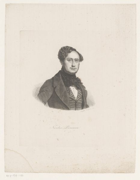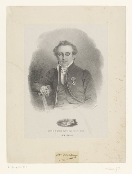 Friedrich Hecht created this portrait of Pierre Levassor using lithography. Without a date, it's difficult to say exactly when the portrait was made, but the artist's life, spanning the late 19th and early 20th centuries, provides some context. Hecht, who lived during a period of significant social and political change in Europe, shows us Levassor, a man of apparent importance, depicted with a quiet confidence. He is leaning casually against a chair, his dark coat and bow tie speak to the conventions of bourgeois respectability. What does it mean to memorialize someone in this way? How does this portrait reflect the complex dance between public persona and private identity, especially during an era defined by strict social norms? It invites us to consider not only Levassor's life, but also the choices made in representing him, and the values that such a representation upholds. The portrait offers a glimpse into a specific historical moment, inviting reflection on the individual within the broader socio-political landscape.