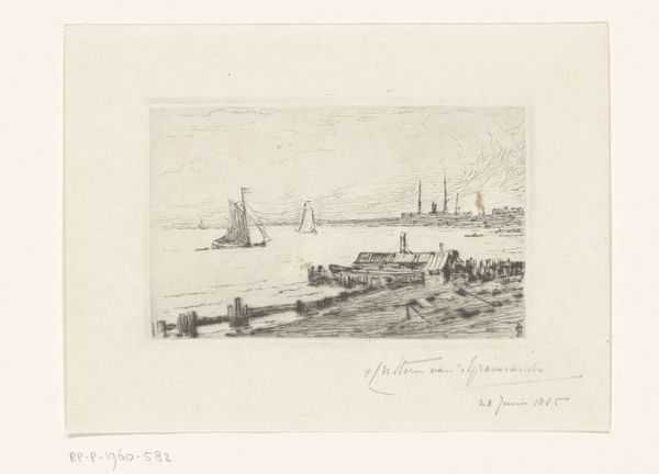 Curator: What a hauntingly beautiful landscape! This is Stephen Parrish’s "On the Schroon," an etching from the late 19th century. Editor: Yes, haunting is the word. There's something desolate about this scene, almost industrial. You see those bare trees on the horizon; it looks as if something has stripped the landscape bare. Curator: It's a study in contrasts, wouldn't you say? There is that rawness but the delicate etching technique lends a certain softness. The scene almost glows from within, it recalls an idealized view of a bygone era, almost an elegy. Editor: Perhaps. But consider the period. Late 19th century, rapid industrial expansion, environmental exploitation… These landscapes are often complicit, aestheticizing a moment of profound upheaval and dispossession. What is elegiac for some, is built on the forced departure for others. The very notion of wilderness is a construct rooted in the exclusion of indigenous stewardship. Curator: A very interesting point! I read those skeletal trees as symbols of resilience – a forest in recovery! What are we meant to do with imagery that lingers over landscapes of environmental loss or distress? In that regard, wouldn’t Parrish’s landscape be of interest today as it depicts a memory or an experience that can be considered “earth-based?" Editor: Exactly, its ongoing symbolic work. And how those earth-based experiences were, and still are, available to whom, and at what cost? This image reminds us of that complicated legacy, in its idyllic portrayal. Also, let’s not forget the context of etching as a medium – its proliferation made landscape imagery accessible in new ways. What power comes from that kind of circulation? Curator: True, etching allowed for the wider dissemination of landscape images. It’s amazing how a seemingly quiet image can spark so many questions. Thanks for sharing such vital historical and social contexts! Editor: Indeed. It goes to show how even the most apparently placid landscape can hold layers of history, ideology, and untold stories. Thanks for uncovering its hidden symbolism, to complement these concerns!