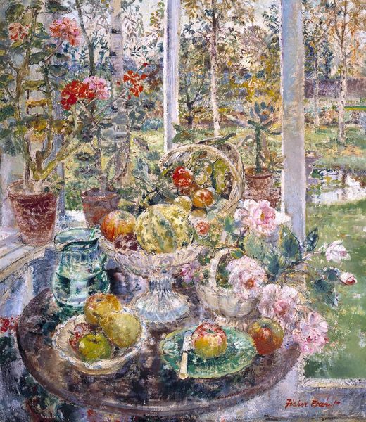Curator: It gives me a somewhat mournful feeling, this overflow of flowers. As if they're present to both honor and commemorate something... someone? Editor: Indeed, a heavy, stifling interior! This feels very much a constructed space, even down to the layering of paints. One sees Hassam deliberately adding density to an otherwise light, airy genre. This piece is *The Altar and the Shrine*, dating to 1892. Curator: I find it so fascinating how Hassam frames domestic life. Even simple flowers, a small table setting becomes charged, imbued with the ritual weight of shared existence. What exactly, or *whom*, do you believe he elevates to the status of shrine? Editor: Given the visible brushstrokes in this watercolor work, he quite plainly foregrounds the hand of the artist here, in addition to showing all of these surfaces – fabrics, the vase shapes and light upon them. It is all surface, nothing more! No depth. Curator: Don’t you find it poignant how this surface treatment suggests fleeting memory itself? See how some forms coalesce, only to dissolve back into abstraction, into that *ground* of daily experience. It reveals more, paradoxically, because of this abstraction. Take the framed portraits near the top... aren’t they ancestors looking on, in effect? Editor: Perhaps, or just more stuff. More objects in an environment primed for accumulation and display. That being said, Hassam manipulates the paint here quite skillfully! Observe the heavy impasto suggesting textile draped across the composition's mid-section, as an illustration of labor as well as adornment. Curator: The shrine could simply be the home, its collective atmosphere given presence by the flowers… by, as you say, the textiles too. Assembled, painted, and remembered! The light is gorgeous: suffusing every object, yes, but it cannot, in the end, break through that pervasive, melancholic mood. Editor: I concede a shift: it is a still life imbued with human touch by way of domestic life. I suppose a melancholy is bound to permeate, given how all these items eventually break, wear out, fade away! Curator: Yes... that’s well put! Everything points back toward something temporal here. Thank you, as always. Editor: Agreed, I have enjoyed parsing this painting from a refreshing angle!
