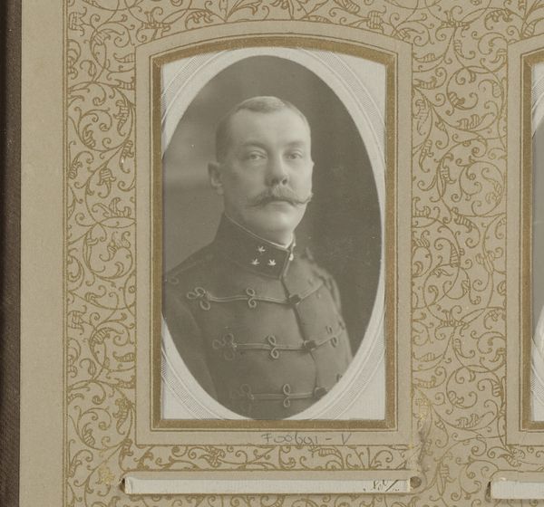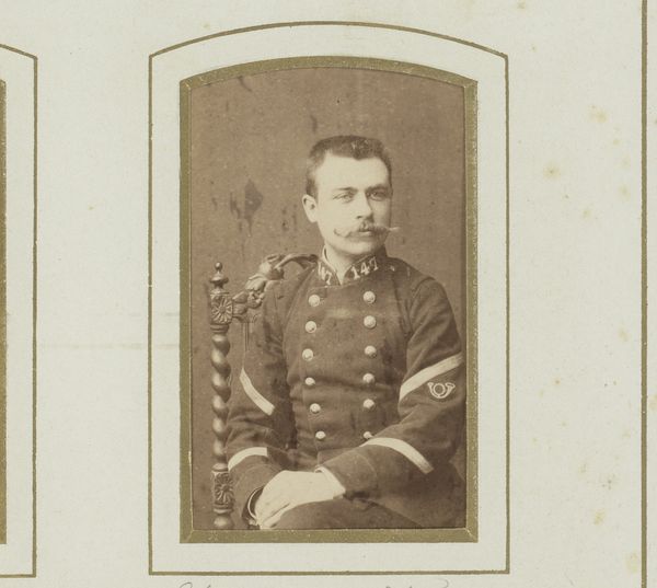 Editor: This is a captivating vintage photograph, titled "Portret van een man in uniform," dating from 1870 to 1900, created by Franz Neumayer. The subject's poised demeanor and the tonal range of the sepia tones create a serious mood. How would you interpret this portrait from a formal perspective? Curator: Considering solely the internal elements, the portrait relies heavily on geometric rigor. Observe the regimented symmetry of the uniform’s buttons, balanced by the off-center placement of the man himself within the frame. The stark contrast between the crisp edges of his attire and the softer backdrop creates a visual tension. How do you perceive the interplay of these formal elements? Editor: I notice how the limited tonal palette seems to flatten the image, emphasizing its two-dimensionality rather than depth. It makes me wonder about the constraints of the photographic technology available at the time. Curator: Precisely. And how might the constraints of the technology affect the aesthetic choices made by the artist? Does this piece communicate, through the formal structure, its historicity or simply illustrate its contents? Editor: It seems the subject's immobility enhances the flatness, as if turning him into a symbolic rather than a lifelike form. Curator: The uniform’s sharp lines further articulate this sense of formal representation, perhaps subordinating individuality to the representational purpose of the image. Editor: This perspective has completely reshaped how I view the work. Thank you for highlighting its formal composition. Curator: Indeed. Analyzing art in this manner grants us insight into its internal logic, allowing an enriched contemplation on the choices of the artist, freed of external influences.