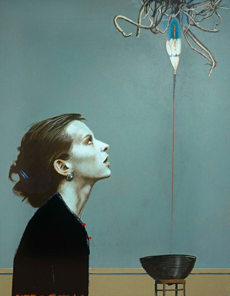 Erik Thor Sandberg painted 'Complacency,' and its somber tones and stark imagery create a scene of subdued tension. The dark background throws the figure’s pale skin and the odd antler headdress into sharp relief, immediately grabbing your attention. The composition places the subject off-center, enhancing the feeling of unease. Sandberg uses the interplay of light and shadow to sculpt the figure, giving it a palpable sense of presence. The antler, bound to the figure’s head, introduces a bizarre, almost surreal element that disrupts any straightforward reading. A single, thorny object dangles precariously, heightening the sense of vulnerability. The work evokes questions about identity and imposed burdens. The antler and the hanging object could be interpreted as symbols, perhaps alluding to cultural expectations. 'Complacency' invites us to consider how these structures can confine and define us.