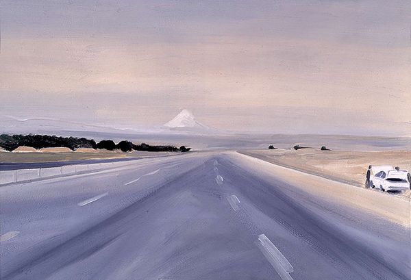 Mostafa Dashti created this Untitled painting with serene tones of blues and greys, which immediately evoke a sense of calm and introspection. The composition is structured by the strong verticals and horizontals of what appears to be a window frame, dividing the landscape into distinct segments. Notice how Dashti uses the window not just as a frame but as an integral part of the visual experience. This technique destabilizes the conventional boundaries between the interior and exterior, inviting us to consider how perception is always mediated. Semiotically, the window functions as a sign, representing both a barrier and a portal to understanding the world beyond. The subtle brushstrokes and muted palette further contribute to the painting’s contemplative mood. Through this seemingly simple scene, Dashti engages with complex ideas about space and representation, challenging our assumptions about what we see and how we interpret it. The act of viewing becomes a process of reflection, mediated by the structural elements of the painting itself.
