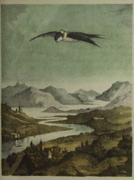 Editor: This is Esq Tom Phillips' print from his "Canto XXIX" series. I find the contrast between the grounded figure and the flying machine really striking. What do you make of this image? Curator: It certainly speaks to themes of aspiration and technological hubris, doesn't it? Consider the historical context: Phillips created this in the late 20th century, a time of rapid technological advancement. How might this image be a commentary on the promises and potential dangers inherent in progress? Editor: I hadn't considered the dangers. It seems so hopeful at first glance. Curator: It's about questioning whose progress, and at what cost. Is the grounded figure an observer, a casualty, or perhaps even a saboteur of this airborne ambition? Editor: I see it now. It makes you wonder about the implications of advancement on different people. Thanks for your insight!