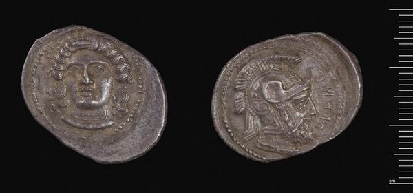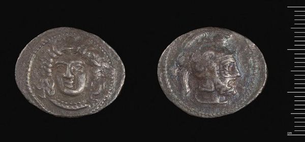 Editor: We’re looking at the Stater of Tarsus under Datames. This small coin has two very distinct faces—literal faces! What strikes me is the detail the artist was able to achieve on such a tiny surface. What do you see in this piece? Curator: Indeed. Observe the careful delineation of the facial features, the precision of the hair. Consider how the artist manipulated the medium to create depth and relief. This, in itself, is a testament to the formal elements at play. Note how the artist has used the circular form to create a self-contained world, drawing the eye inwards. Editor: So it’s about how the artist used the coin’s shape? Curator: Precisely. The artist's masterful control is the key; they transcend the coin's basic function to make art. Editor: I never would have thought of that. Thanks for pointing out the artistry. Curator: My pleasure. It’s in these details we find the art.