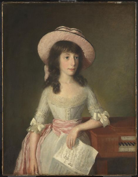 Curator: Mather Brown painted this "Portrait of a Young Woman" in 1801. The subject sits beside a fortepiano, a roll of music clutched in her hand. My immediate impression is of delicate stillness; the artist masterfully uses light and shadow to focus the viewer's gaze directly on her. Editor: It's certainly pretty, in that classically stifled way of representing women, especially through musical performance. One wonders about the extent of her agency. Was music truly her passion, or simply another attribute of refined domesticity, part of her marriageability? Curator: Considering the time period, it is more likely the latter. Observe the controlled, balanced composition and the idealized features of her face. The formal elements communicate restraint, mirroring societal expectations of women. Note also the subtle asymmetry—the instrument isn't centered behind her. Editor: Exactly! Her connection to that musical instrument seems less about personal expression and more about performance, perhaps even a transaction. Did possessing such skill make a woman more marketable? Look at the folds of her white dress. Though beautiful, the fabric also somewhat shrouds her, concealing individuality. Curator: The white dress, with its subtle neoclassical influence, emphasizes the aesthetic ideals of the era, but I see what you mean. There's a sense of imposed purity, literally white-washed into this young woman's presentation, reflecting, as you said, the values projected onto women. Her modest posture and attire enhance that notion. Editor: We can examine what might be absent. Are there indications of professional pursuits or independent thought? We're left contemplating her role as wife, mother, caretaker. The open sheet music hints at talent. If cultivated, might that have led her to compose, not just play? Curator: A counter-argument could be made based on her direct gaze, a challenging stare that is very slight, however, it communicates a presence that counters total passivity, wouldn’t you say? Editor: Perhaps we project that. Maybe the intention of the portrait was about control—displaying what the sitter *should* be more than what she *was*. Regardless, that open music score hints at latent creativity within her—a space to reflect on a changing status for women during this age. Curator: Looking at the work together, I now see a narrative far deeper than originally anticipated, making her story one that needs revisiting through this contextual lens. Editor: Yes, it seems her representation inadvertently allows us a small but potentially powerful glimpse into societal restraints through art.
