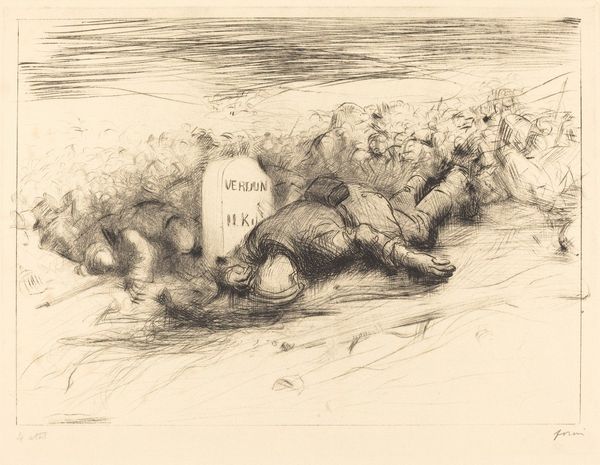 Jean-Louis Forain made this etching, ‘The End – Verdun’, sometime around the First World War. Look at how he's used these scribbly, scratchy lines. It’s all about the process, isn't it? Like he's trying to get something down quickly, before it disappears. The way he's layered these lines, it’s almost like he's building up a kind of emotional texture. See how the bodies and the landscape kind of merge together? There's a real physicality to it, you can almost feel the weight of the bodies, the grit of the earth. And then you've got that tombstone sticking out, like a full stop. It's stark, no messing around. Forain reminds me a bit of Käthe Kollwitz, that same sense of empathy, that commitment to showing the harsh realities of life. Neither of them are trying to pretty things up. They're just showing it like it is, or was, and leaving us to figure out what it all means. And maybe that's the point, there is no single, easy answer.