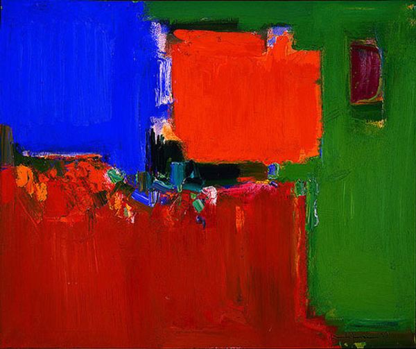 Editor: This is Hans Hofmann's "Renate's Nantucket," painted in 1965, using acrylic on canvas. It’s...vibrant, I guess is the word that springs to mind. All those clashing blocks of colour, vying for attention. I'm curious – what *you* make of it? What feelings or ideas bubble up when you look at this particular painting? Curator: Ah, yes, Hofmann. I think with "Renate's Nantucket", Hofmann throws us right into the throes of visual sensation. Nantucket, a place so vivid, Hofmann's colours – they don’t just describe a landscape, they *become* the experience of one. Notice that electric orange square – does that remind you a little bit of a sunset or perhaps the side of a building catching the light? Editor: I can see that. It’s almost jarring though. The colours feel so intentionally separate. Curator: Exactly! That separation is the point, perhaps. Hofmann plays with the idea of 'push and pull,' the push of one colour against another creating a visual energy. It's about how we, as viewers, synthesize the chaos, create our own Nantucket in our minds. Does it invite you in? Editor: It's growing on me, the more I think of it as less a picture of a place and more of an emotion. And it makes me think of memories—all broken up and only partially recalled. Curator: I adore that! It's like a memory-scape; impressions layered on top of each other. Maybe that is why this feels so special. It’s like looking at somebody's lovely but imperfect memories of Nantucket Editor: Absolutely. Thanks – you’ve definitely given me a new way of looking at abstract art in general. Curator: And you, my dear, have given me a fresh breeze on an old favorite. Maybe next summer, we see this view for ourselves, eh?