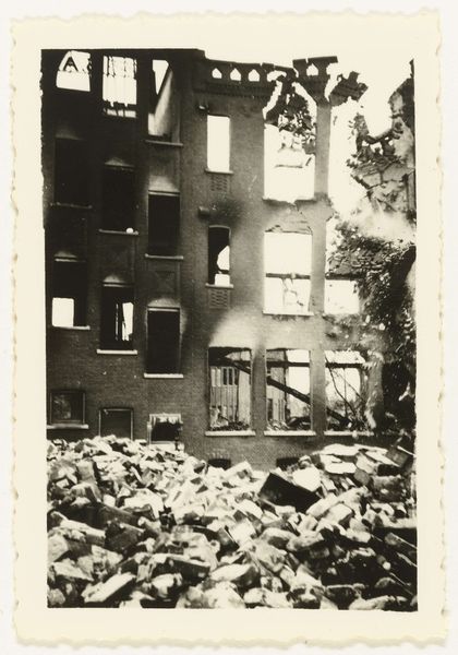 Editor: Here we have Clarence John Laughlin's photograph, "The Head in the Wall." It's hard to pin down a specific date, but the stark monochrome and eerie composition give me the chills. What do you make of it? Curator: It's like a surreal peepshow, isn't it? Laughlin was obsessed with juxtaposing decay and architectural grandeur. The torn-away wall…it's almost as if the past is trying to break through into the present, but only a fragment can. Do you feel that tension? Editor: Absolutely, it's unsettling. It's as if time itself is crumbling. Curator: Precisely! And the building beyond… it's so solid, yet framed by utter ruin. Laughlin's work always asks: What survives? What fades? It's a poetic question, isn't it? Editor: It really is, thanks for sharing your insight!