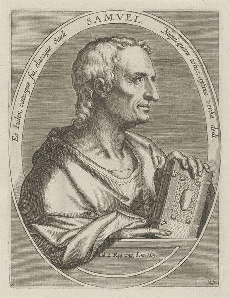 Curator: This print, simply titled "Gad," created in 1613 by Cornelis Galle I, shows a figure in profile, encased in an oval frame. It’s an engraving, part of the Rijksmuseum's collection. What strikes you first? Editor: He seems weathered. You can see the signs of hardship in his face. The artist captured something melancholic. He’s got his hands clasped, resting them. I wonder about his burdens. Curator: Well, Gad himself in the Bible was one of Jacob's sons. His name signifies "good fortune." The phrase surrounding him on the oval relates to a choice between war, plague, and famine; a bit ironic, perhaps. Editor: Irony definitely seems to be at play here. Look at his portrait; you read those furrows, that set of the jaw...and the choice is suffering in all forms? Even the clasped hands look tense. There’s almost a visual paradox. It speaks to the complicated relationship humans have always had with fortune. It’s rarely straightforward. Curator: The composition itself is classic Baroque: dramatic contrast and a flair for representing emotion, despite the simple lines. The line work emphasizes the depth and texture. What I also find telling is the use of scripture at the bottom, tying Gad directly into this historical context. Editor: Indeed. Context is essential here; consider the plague ravaging Europe during that period, then wars brewing, famine always looming...This wasn't just art, it was mirroring collective fears back to the viewers, but anchored in this biblical character. I keep noticing, too, how contained he seems within that oval. Like fate is this unescapable ring. Curator: I completely agree; he is certainly not free to move. This is not just Gad the figure. This is Gad as a symbolic emblem of a tumultuous world, condensed into lines and shadow. The detail for an engraving of that era really draws you in. Editor: Makes you reflect on today, doesn't it? Curator: It certainly does. A poignant statement on human condition—as resonant today as it was then.