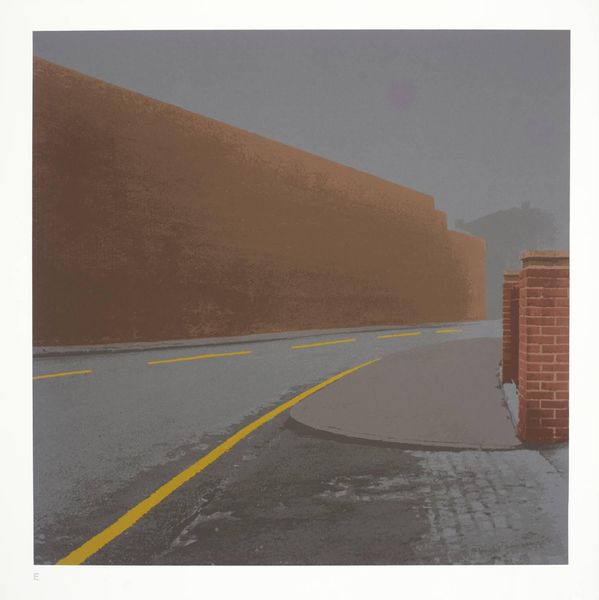 Curator: This is "6. Sheet A" by Gerd Winner, currently part of the Tate Collections. The image is roughly 60 by 60 centimeters. What's your first impression? Editor: Bleak, almost post-apocalyptic. The muted tones and stark geometric shapes give off a very cold vibe. It’s as if a city street has been reduced to its barest essence. Curator: Winner's work often explores urban landscapes. I think here the buildings are simplified to these looming blocks, and the yellow lines become almost abstract bands of color. It reminds me a little of Hopper, but less romantic, more… detached. Editor: Absolutely. The lack of detail, the absence of human figures, it all points to a sense of alienation. It’s not just a street; it’s a symbol of urban isolation. I wonder what it felt like to create it. Curator: Probably a way to explore the emotions, like that feeling of being overwhelmed, that those empty streets often cause. Editor: Well, for me, it definitely evokes a moment of quiet reflection on modern life.